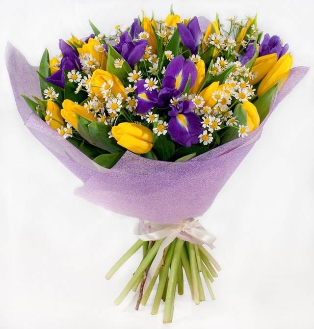 Букет «Созвездие» - это невероятно яркая и красочная цветочная композиция, которая состоит преимущественно из тюльпанов солнечного цвета и нежных фиолетовых ирисов. На языке цветов романтичные ирисы олицетворяют нежность и верность. Композиция выглядит еще более изысканно благодаря скромным невинным ромашкам, а также прекрасной упаковке и ленте, которые помогают подчеркнуть непревзойденный вид цветов. Такой букет вызовет неподдельный восторг у любого человека, а также поможет загладить вину перед любимым человеком.